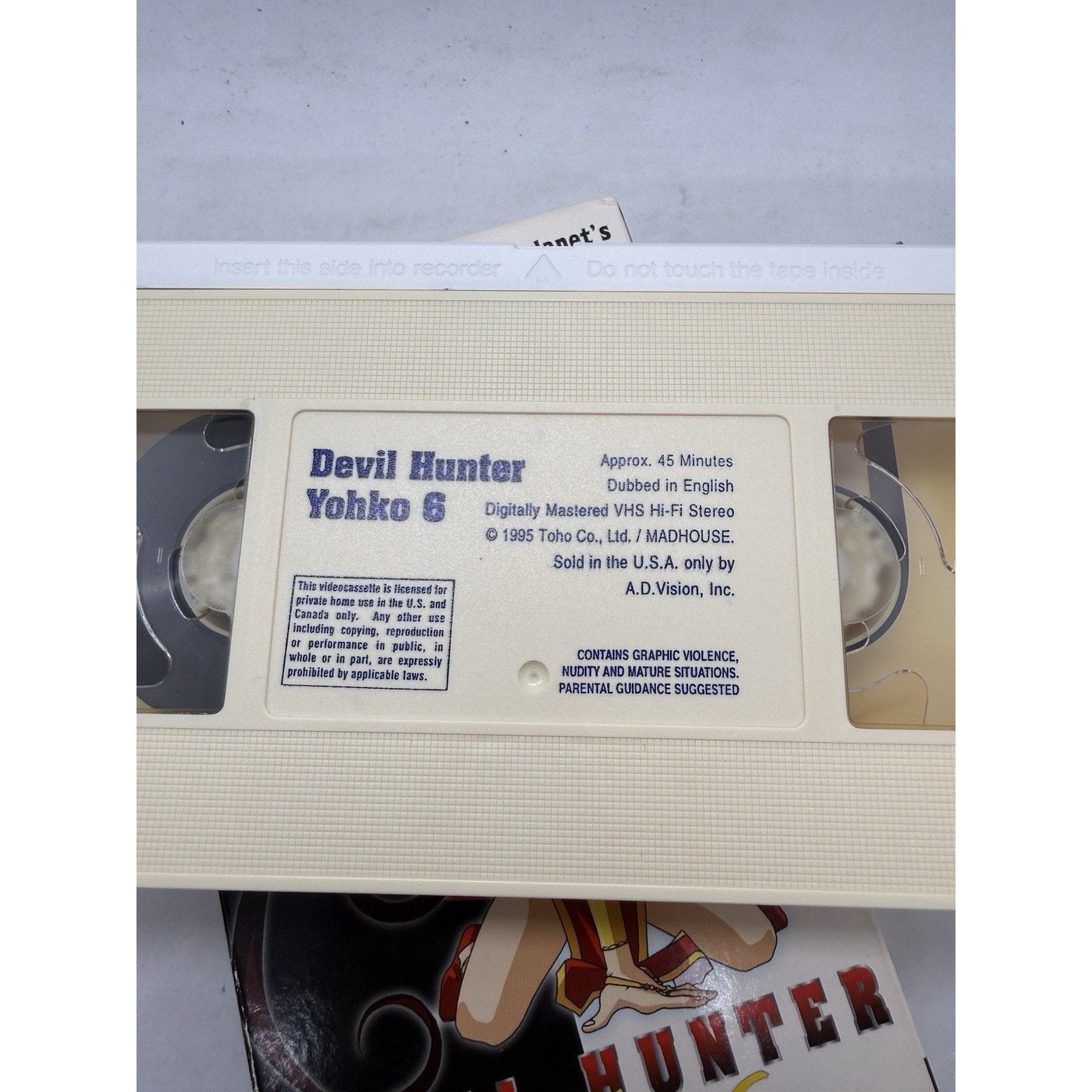Devil Hunter Yohko 6 on VHS, released by ADV Films in 1995. English dubbed version, approx. 45 minutes runtime. Classic anime featuring Yohko in a battle against her toughest opponent yet. Contains graphic violence, nudity, and mature themes (parental guidance suggested).