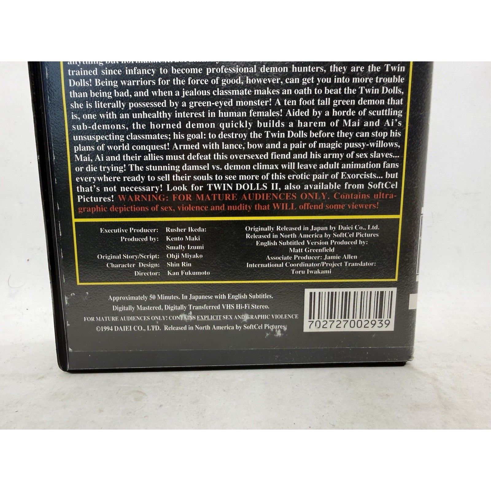 Vintage anime VHS Twin Dolls: Legend of the Heavenly Beasts (1994, SoftCel Pictures). English subtitled, approx. 50 minutes. Features two sisters trained as exorcists, battling demons with magic weapons in a mix of action, fantasy, and mature storytelling. Distinctive red VHS shell.