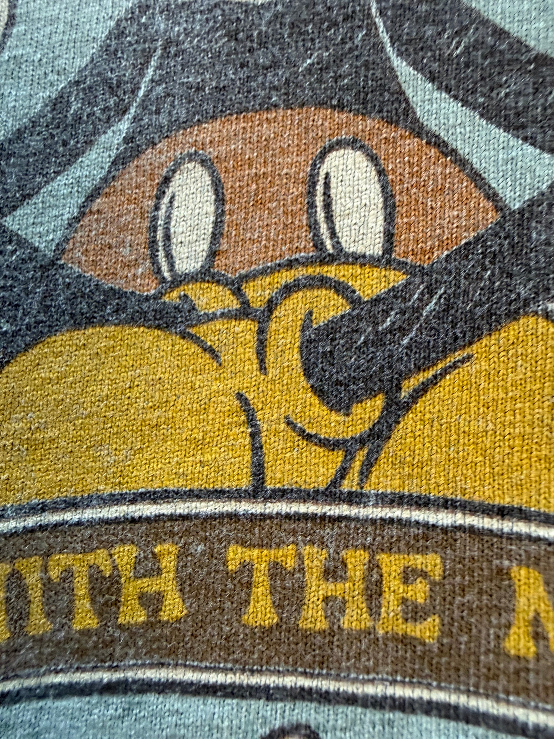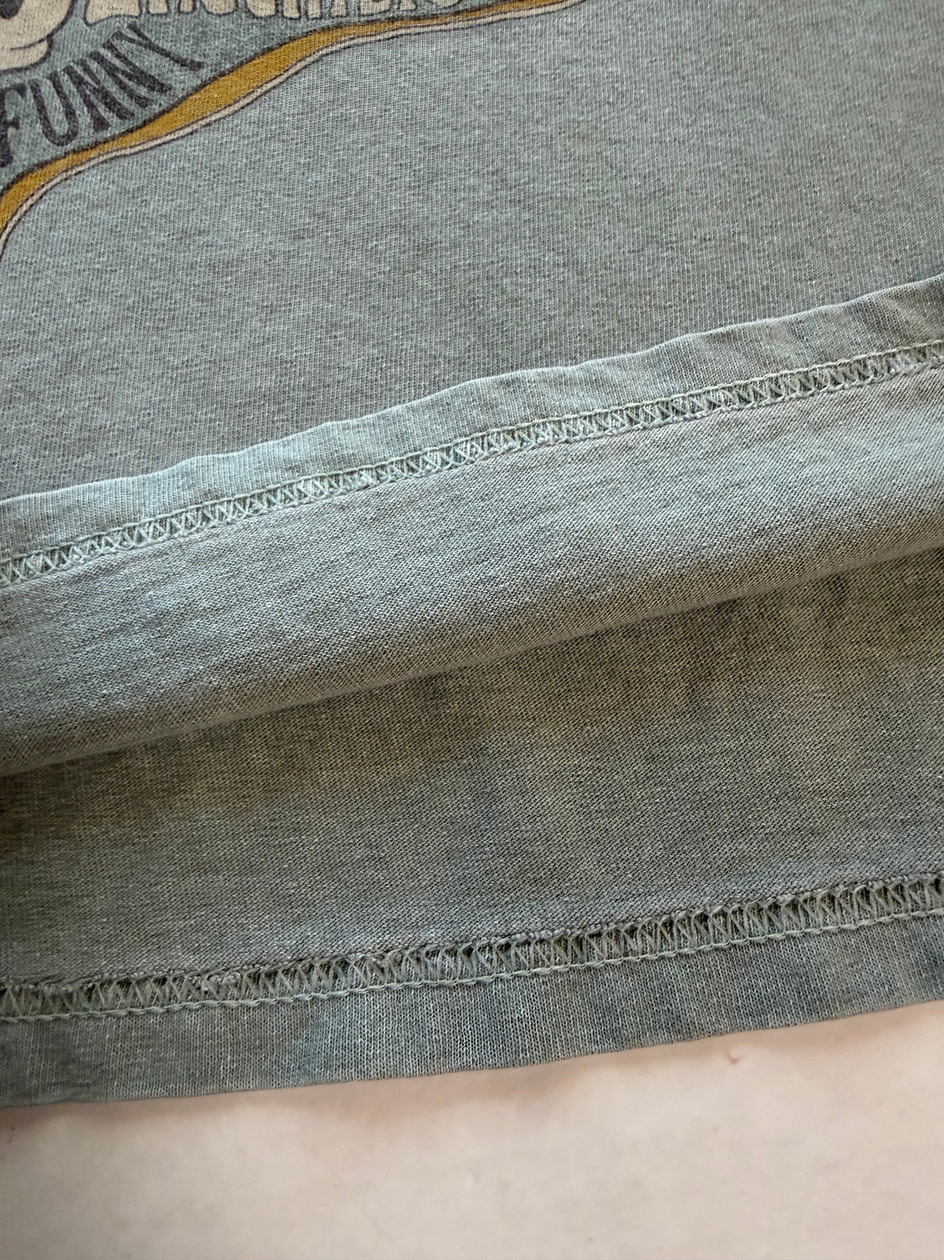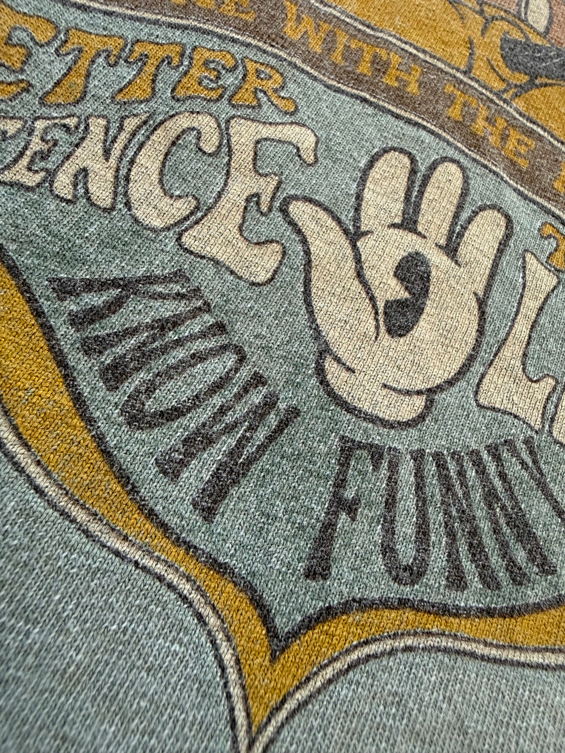 Walt Disney World official. Sage green pigment-dyed tee. Chest 19 in, length 25 in — fits M. Size tag removed. Pathway to Enlightenment / Peace Love and Mickey graphic. Light graphic cracking consistent with age. No staining.