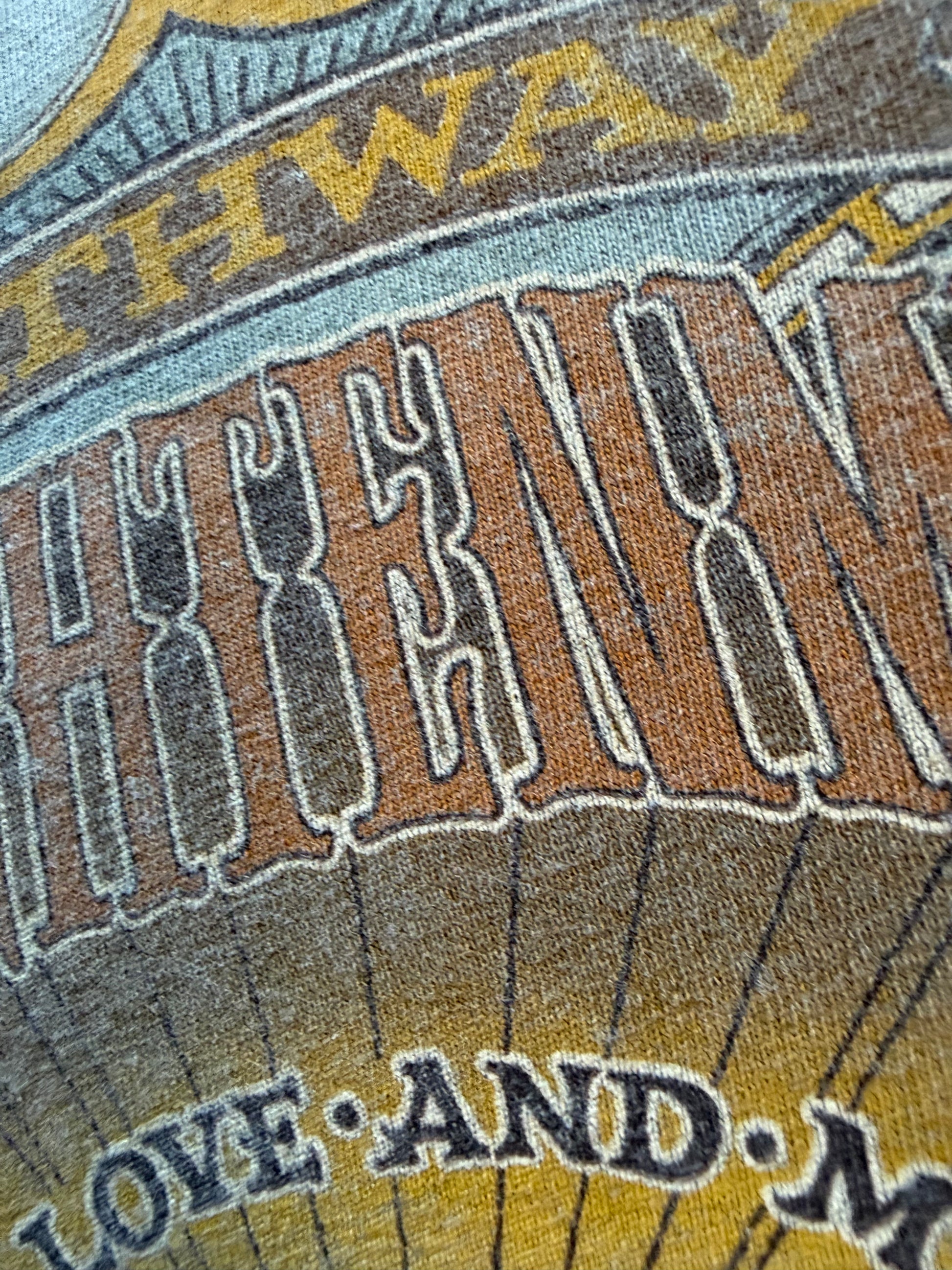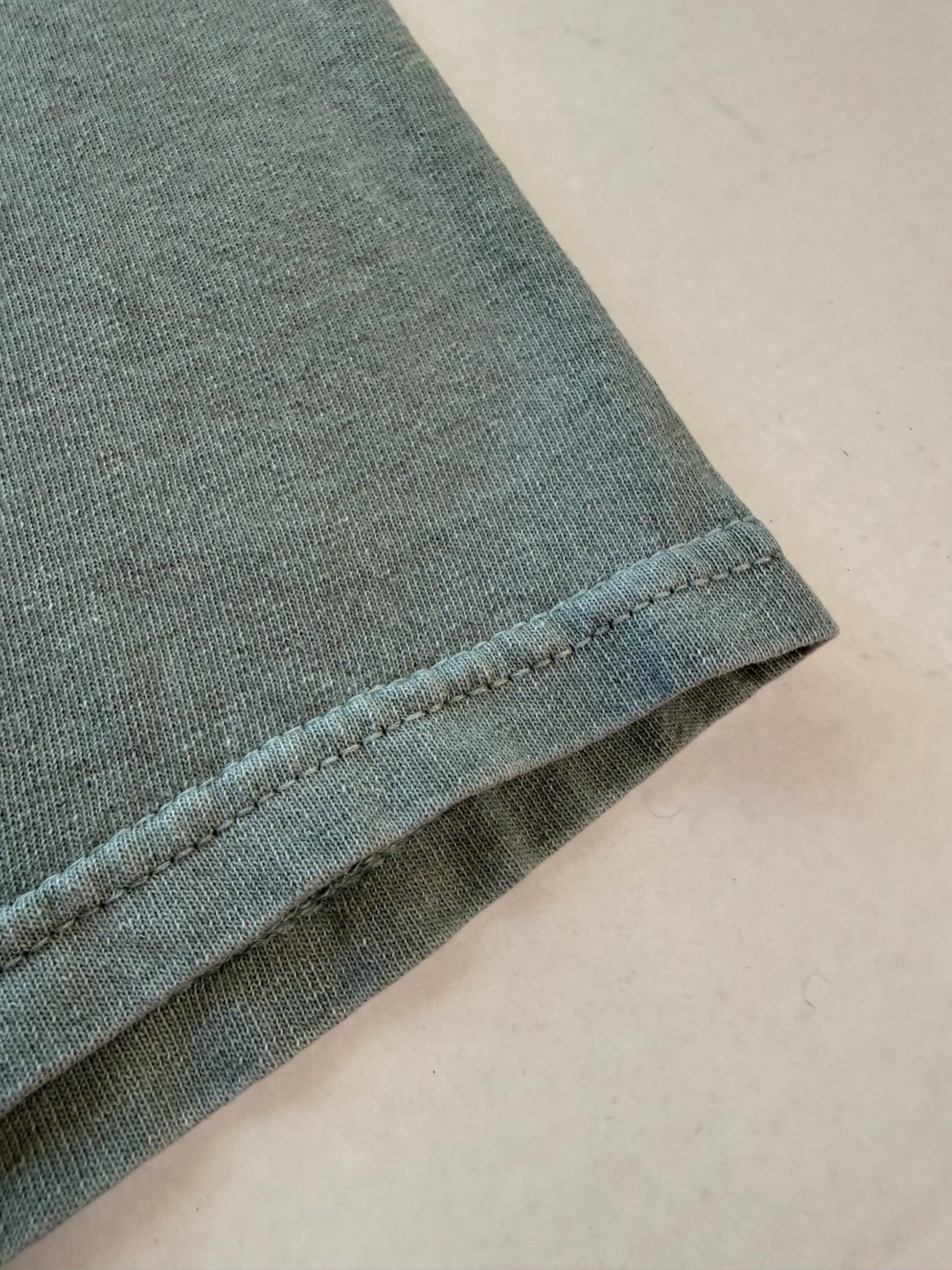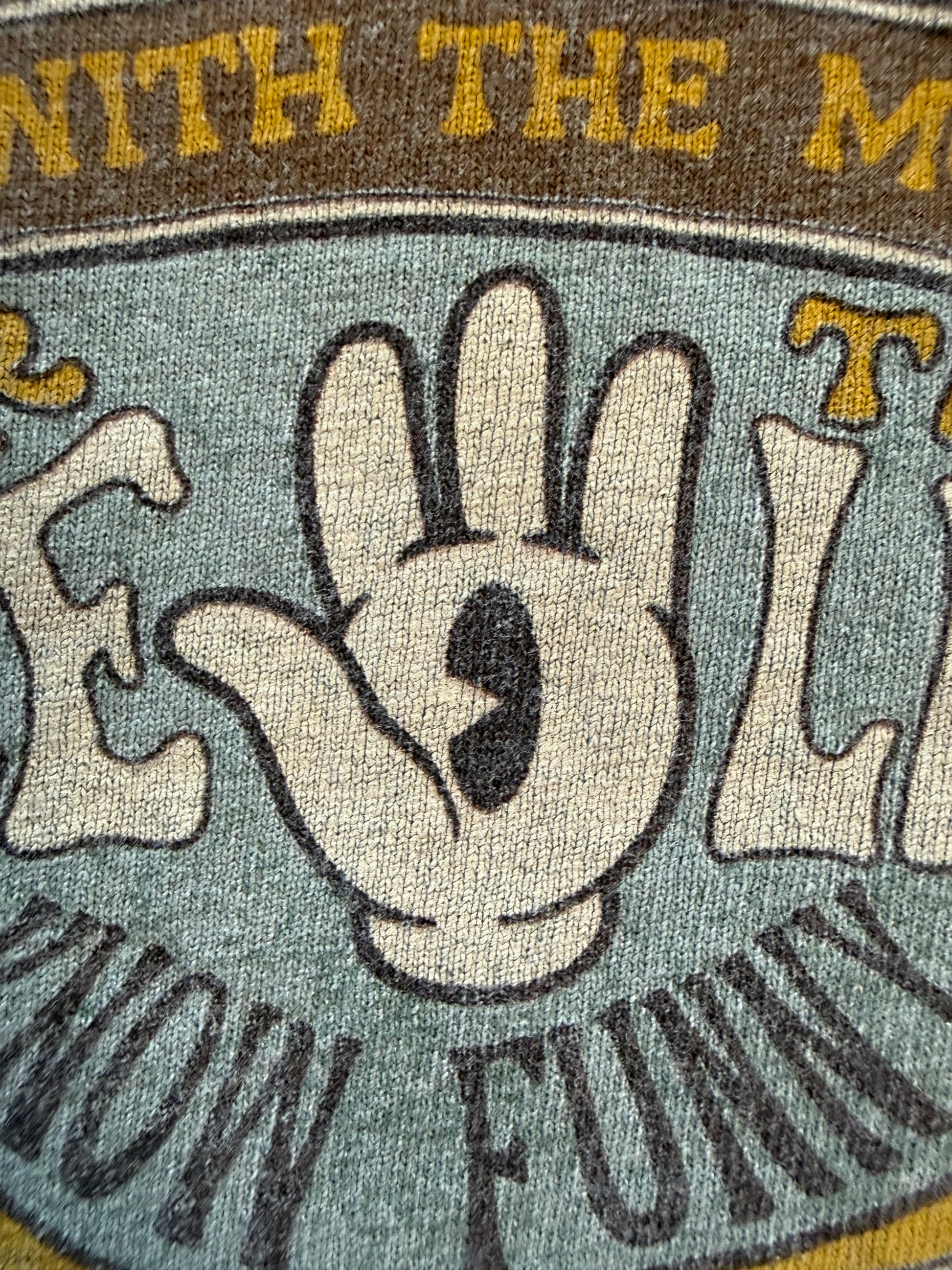 Walt Disney World official. Sage green pigment-dyed tee. Chest 19 in, length 25 in — fits M. Size tag removed. Pathway to Enlightenment / Peace Love and Mickey graphic. Light graphic cracking consistent with age. No staining.