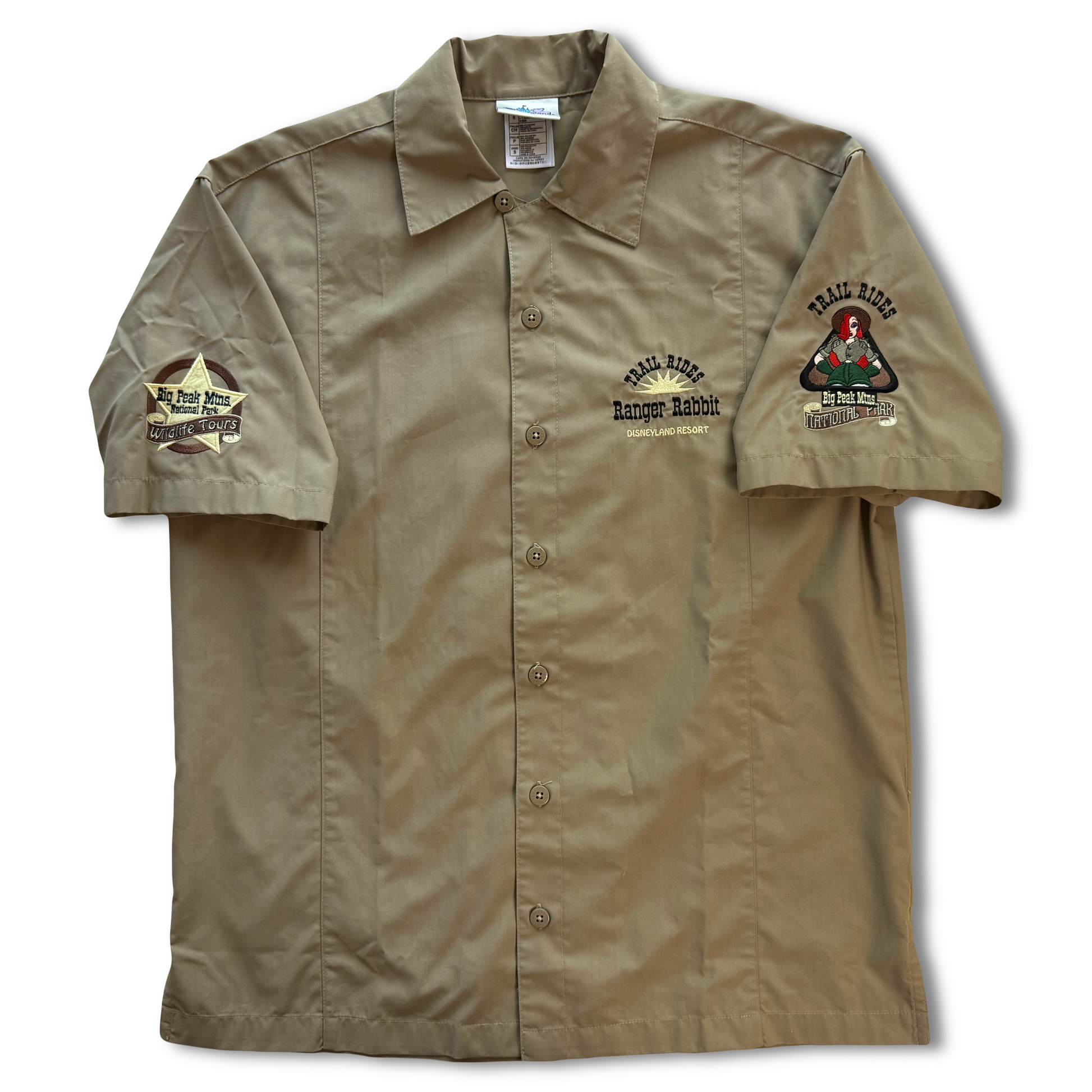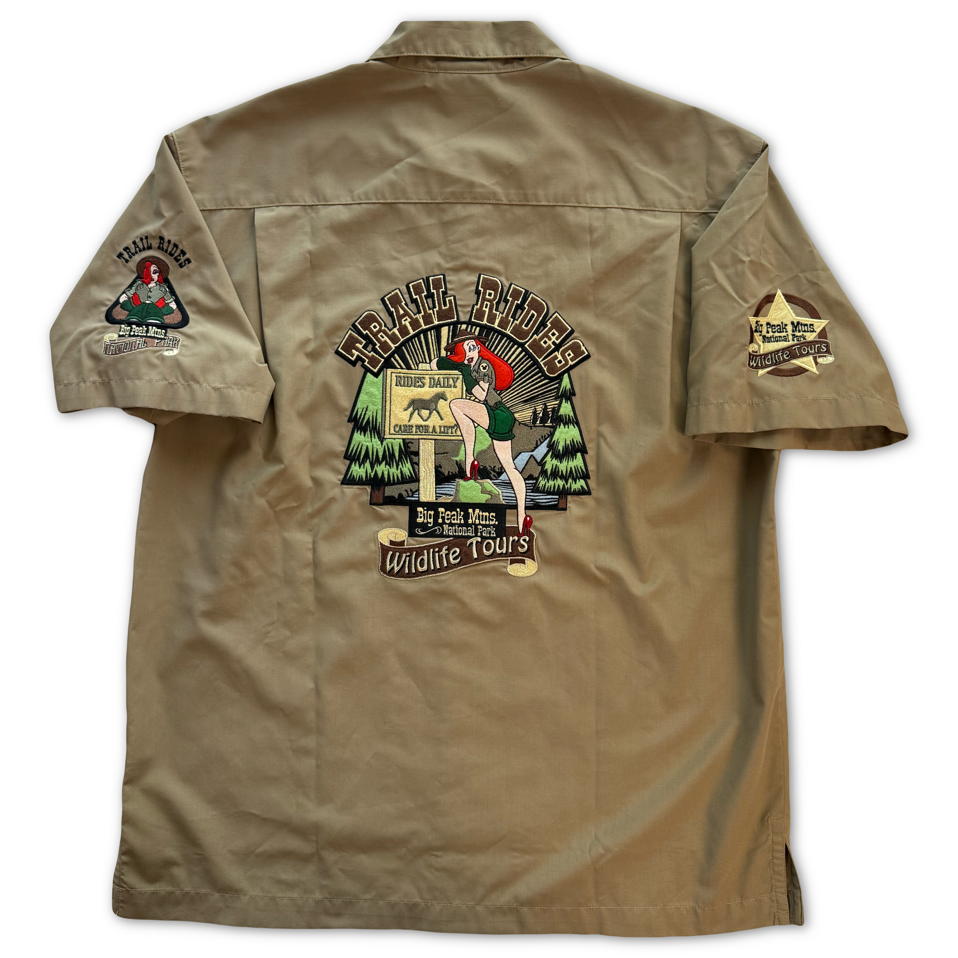 Jessica Rabbit as a national park ranger. Cast member workwear shirt for the fictional Ranger Rabbit Trail Rides attraction — fully embroidered front, back, and both sleeves. Disney branded buttons throughout.