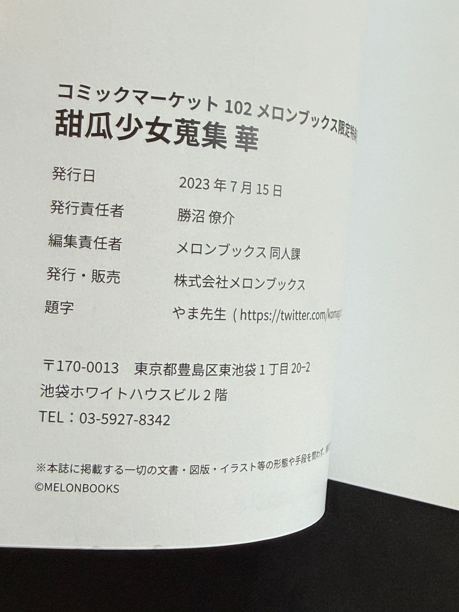Melonbooks exclusive special edition artbook plus novelty card. Published July 15, 2023. Comiket 102. +Brilliant limited edition cover. Includes original C102 Catalog Novelty card (NOT FOR SALE) featuring Melonbooks original characters by Mito, Takei Ooki, Muririn, and Yotsuyotsuba. Both items in excellent condition.