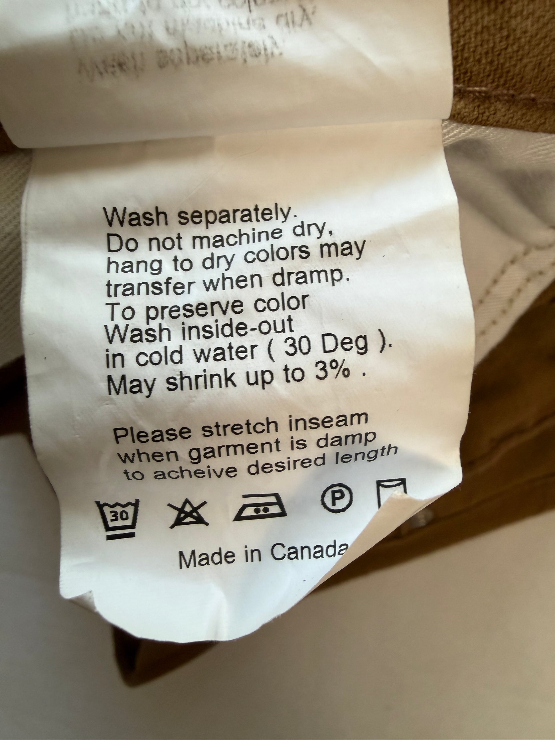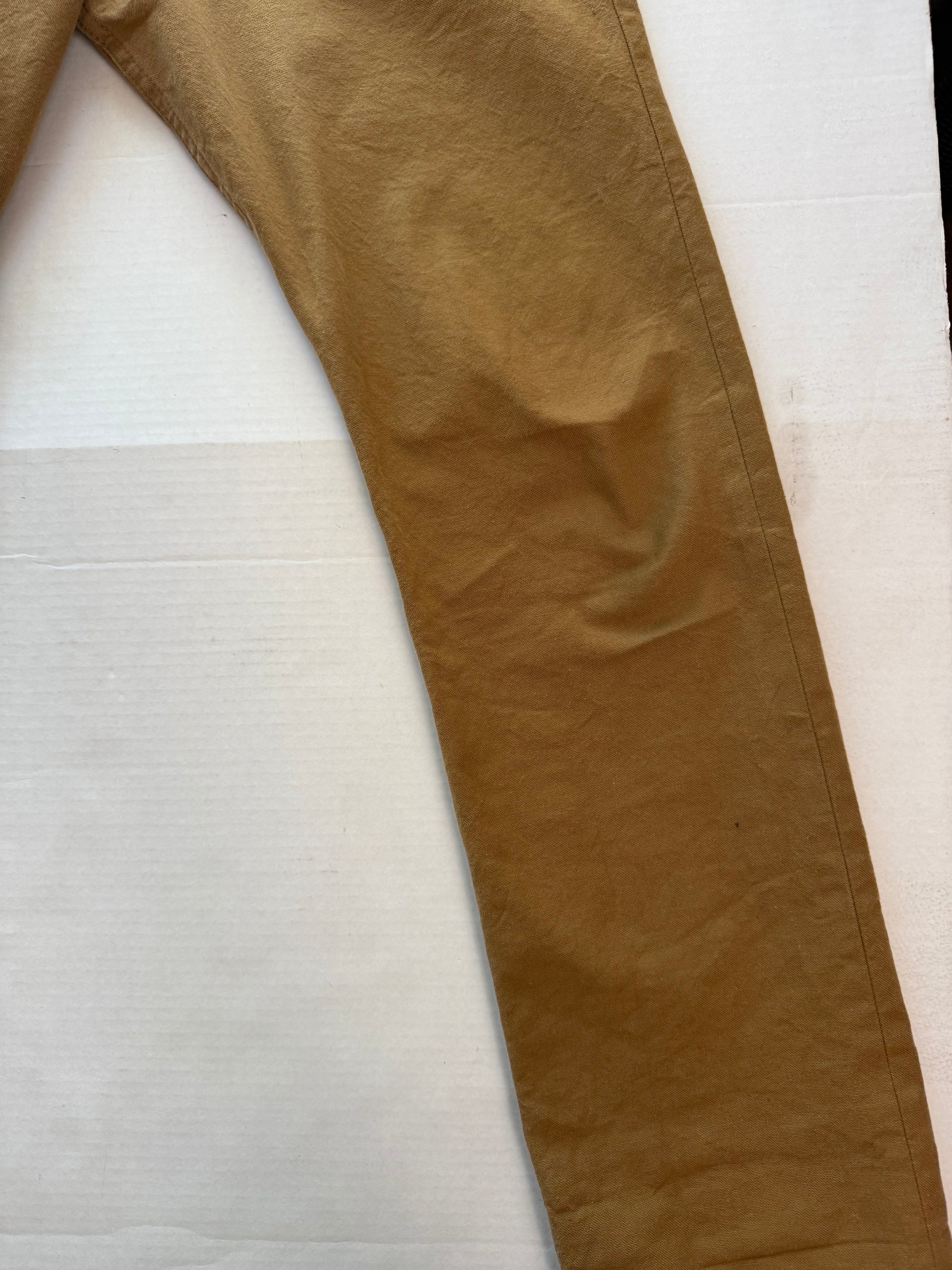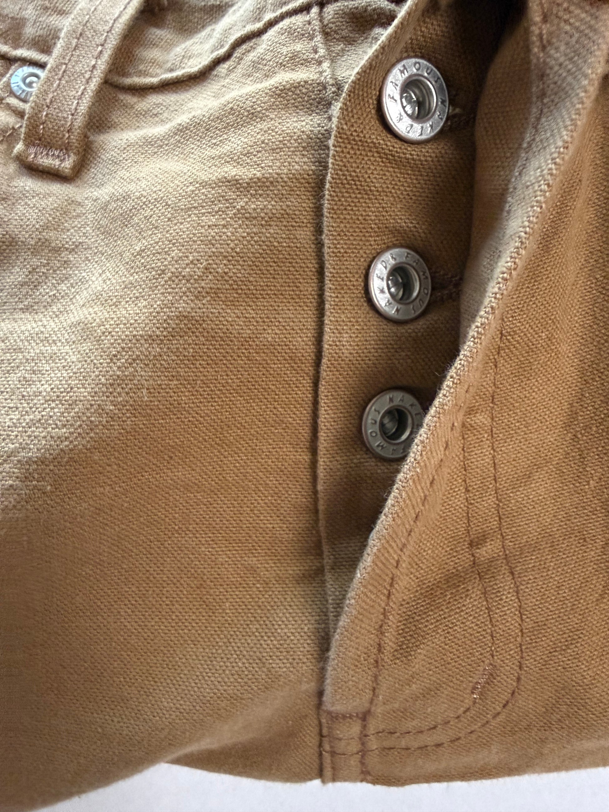 Fit: True Guy. Style: 101021421. 100% cotton. Size 30. 5-pocket, button fly. Caramel brown. General wear, no major staining or damage.