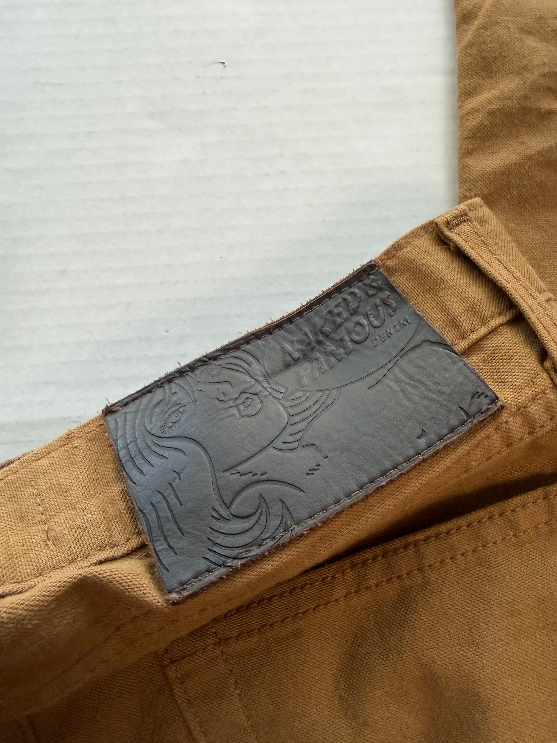 Naked and Famous duck canvas in the True Guy fit — relaxed through the thigh, straight from the knee. 10oz Japanese selvedge duck canvas, caramel brown colorway that develops a vintage patina with wear. Exposed coin pocket selvedge ID, branded hardware, embossed leather back patch. Made in Canada.