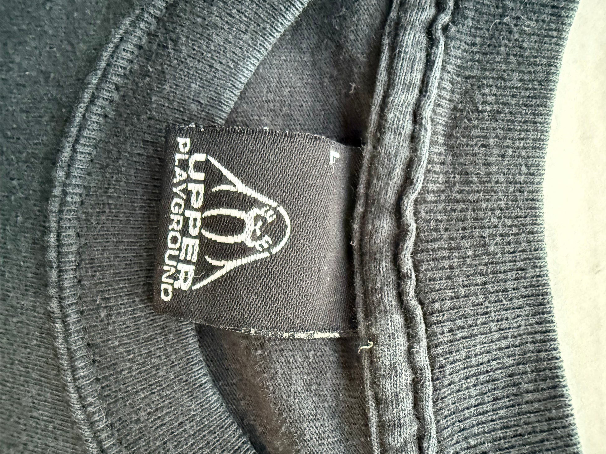 100% cotton. Made in El Salvador. Size L. Faded black. Full chest Baseball Fury graphic with Upper Playground collab branding. Graphic shows age-appropriate fading, overall clean condition.