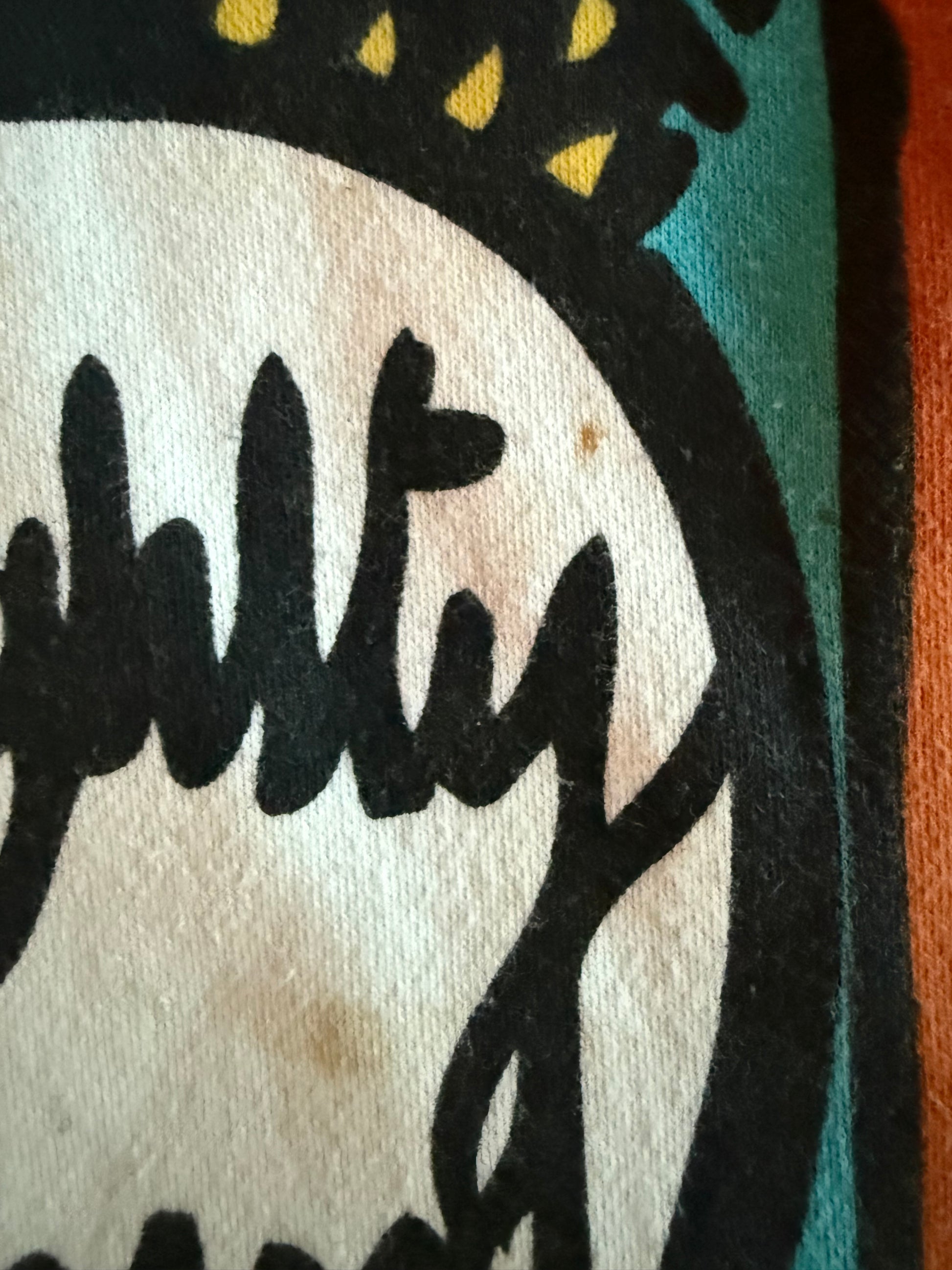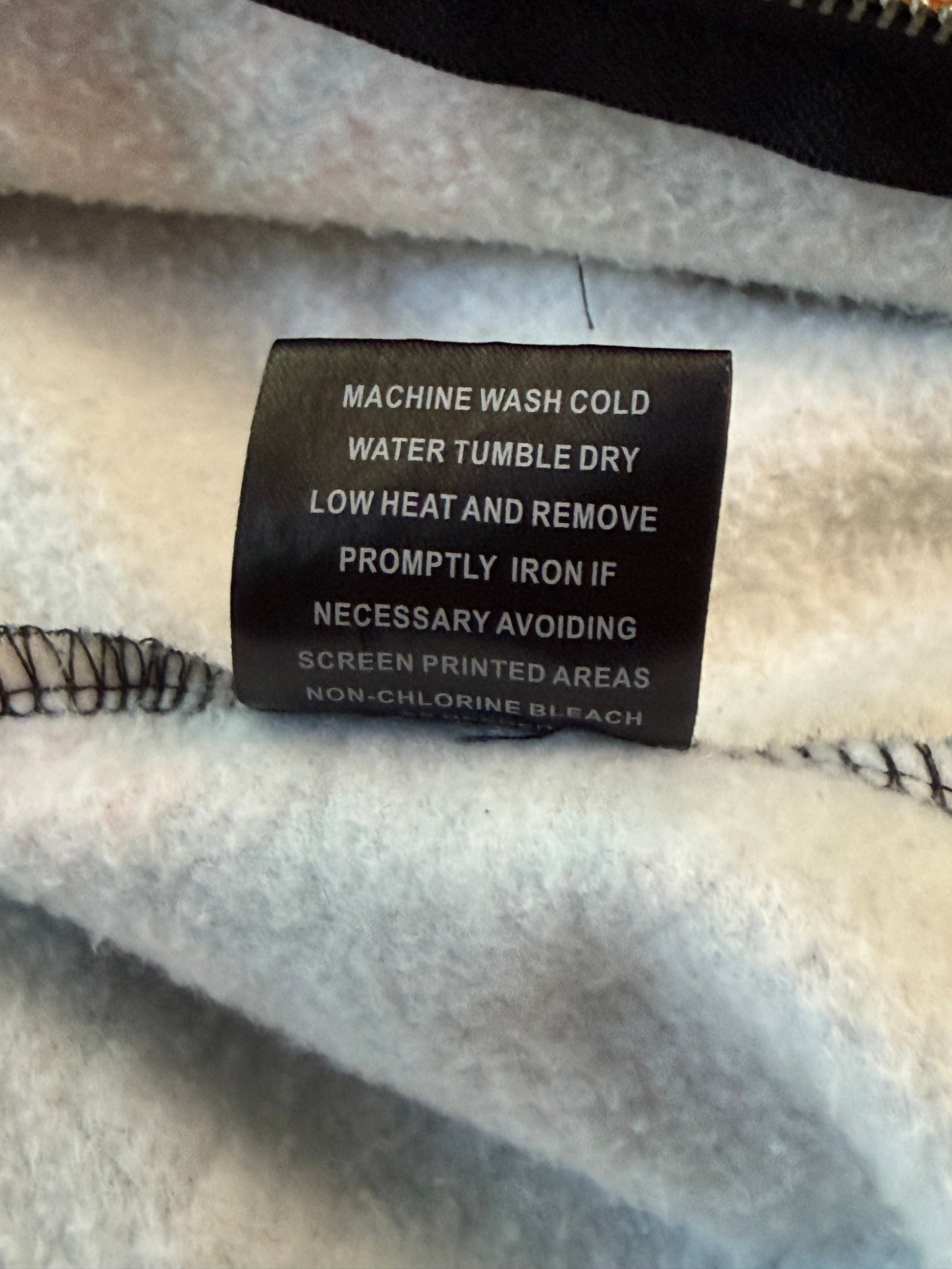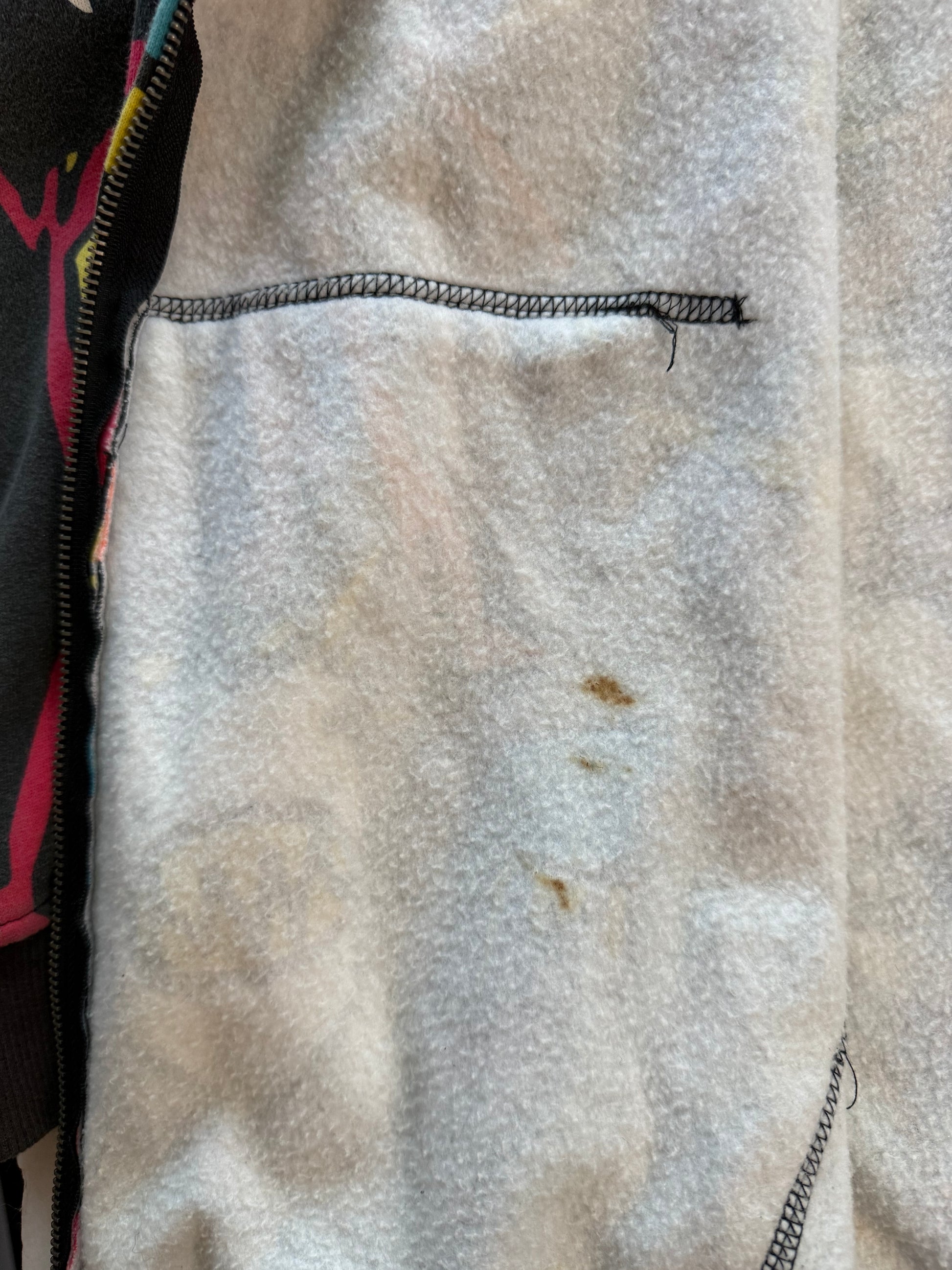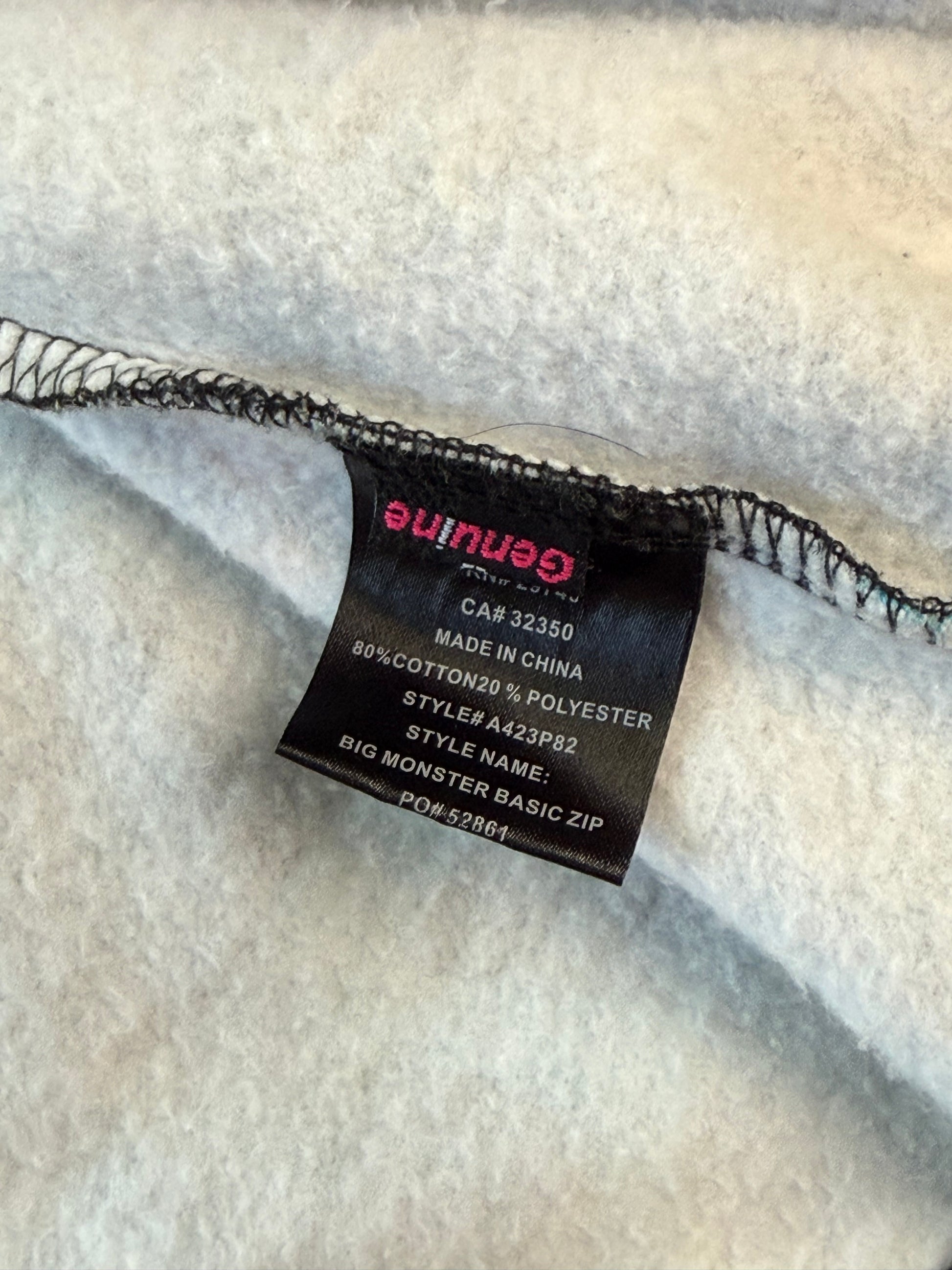 Style: Big Monster Basic Zip. Size XXL. 80% cotton / 20% polyester. Made in China. Condition: small hole/fraying at bottom hem near front print (shown in photos), inner lining shows some discoloration. Graphic and overall structure excellent.